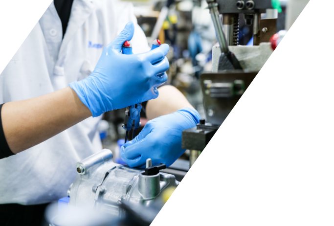 コンプレッサは搭載される車種によって種類が異なり、その数は数千にも及ぶとも言われています。この多品種製品を効率よく安定的に組み立てるために名張製作所では独自の生産システムを構築。一つのラインで多品種生産と量産化を実現しています。さらに生産ロスゼロを掲げ、高品質・高効率と環境負荷低減を追求し続けています。