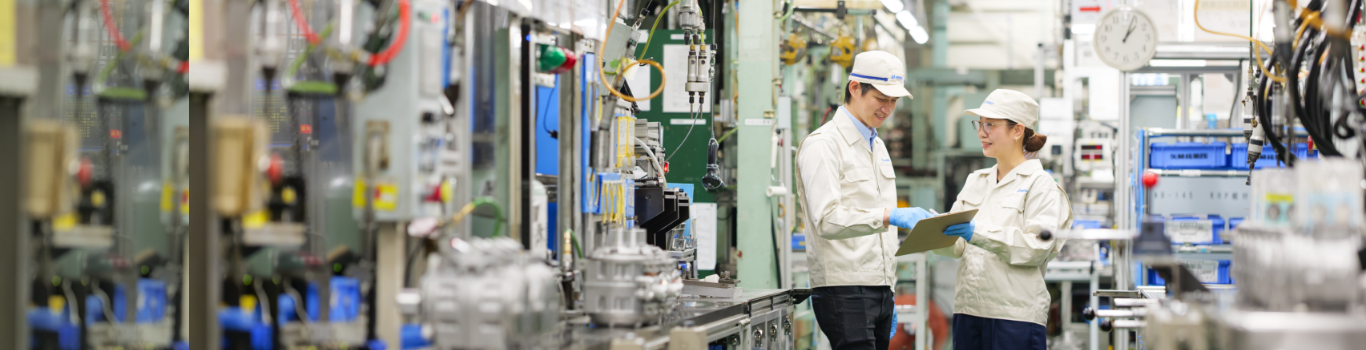柔軟なモノづくり体制カーエアコン用コンプレッサの加工・組立や設備の保全を担当し、多様な製品に柔軟に対応する生産体制を支えています。併設の技術員課ではTPS(トヨタ生産方式)を実践し、人財育成やからくり改善などを通じて、現場の生産性向上に取り組んでいます。