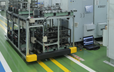 部品や製品は、それぞれの組立工程へ自動で搬送されます。生産技術によって改良を重ねたオリジナルのコンベア式のAGV導入により部品を搬送するだけでなく、組立ラインへの供給にも対応しています。